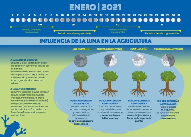 Con el fin de fortalecer las prácticas de reforestación, restauración y agricultura sostenible en nuestras comunidades aliadas de productores de café en Chiapas, México, creamos un increíble calendario que incluye las fases de la luna, así como explicaciones y recomendaciones de actividades agrícolas considerando los efectos de la luna en la naturaleza y los cultivos, además de promover prácticas de Agricultura Climáticamente Inteligente como la preparación de caldos minerales, fertilizantes orgánicos, barreras naturales para retener el suelo, entre otras que fortalecen la resiliencia de los paisajes y comunidades a los efectos del cambio climático, mediante la reforestación y una producción de café más sostenible.
